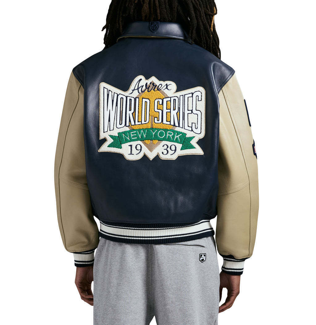 Avirex World Series jacket in 100% leather with World Series embroidered applique at chest and back.