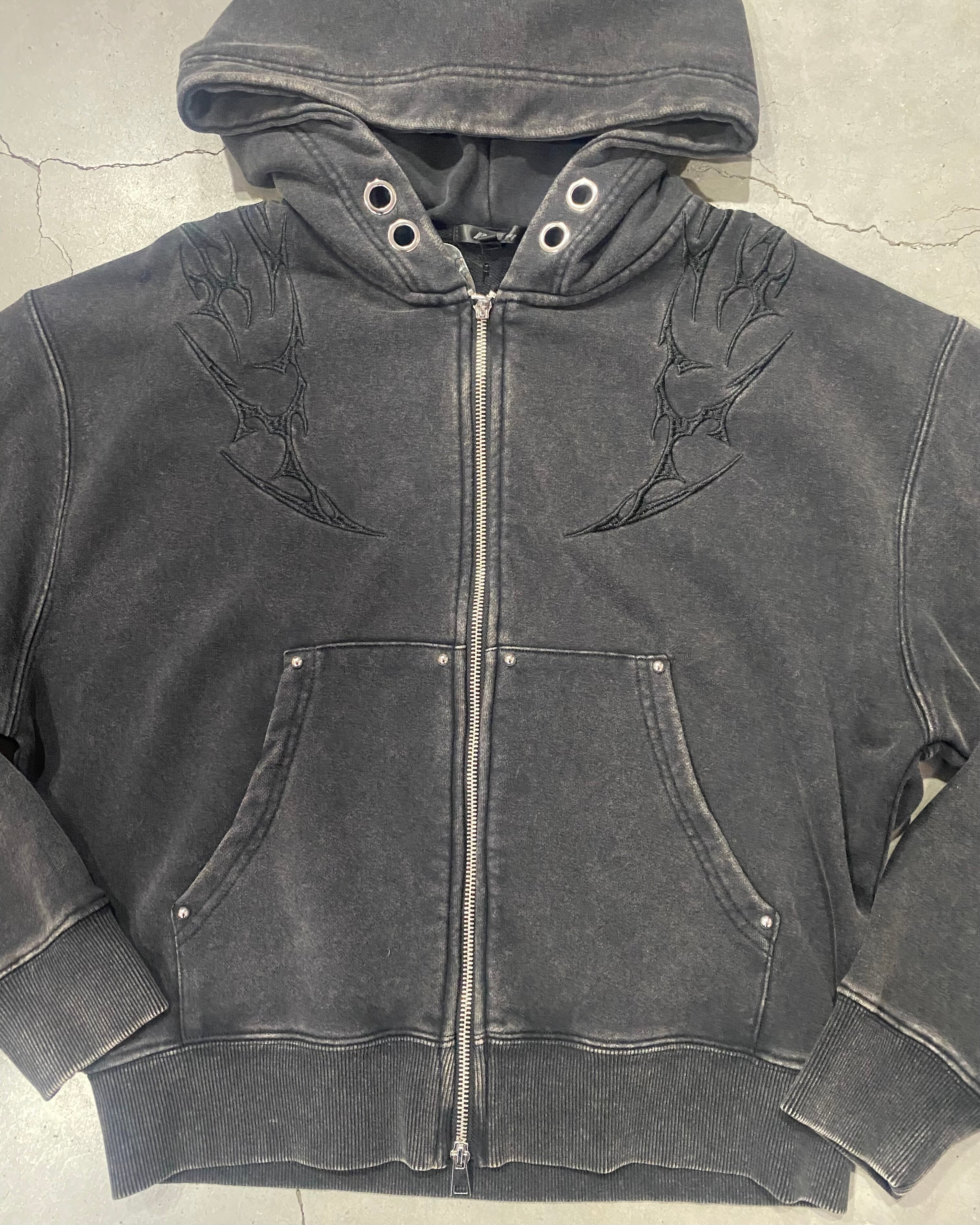 ケミカル加工で風合いのあるショート丈ジップパーカー。存在感のあるトライバル刺繍にポケット部分にはスタッズ付。裏毛素材の柔らかな生地感で、これからの時期はアウターのインナーなどにも使えるし、裏毛素材なので春先まで長いシーズン着用可能。トレンドのショート丈で、着こなしの幅が拡がるダブルジップ仕様。身頃はゆったりしたデザインで、ストリート、古着風、韓国ファッションなど様々なコーデに合わせやすい。女性の方にもおススメのユニセックスアイテム。