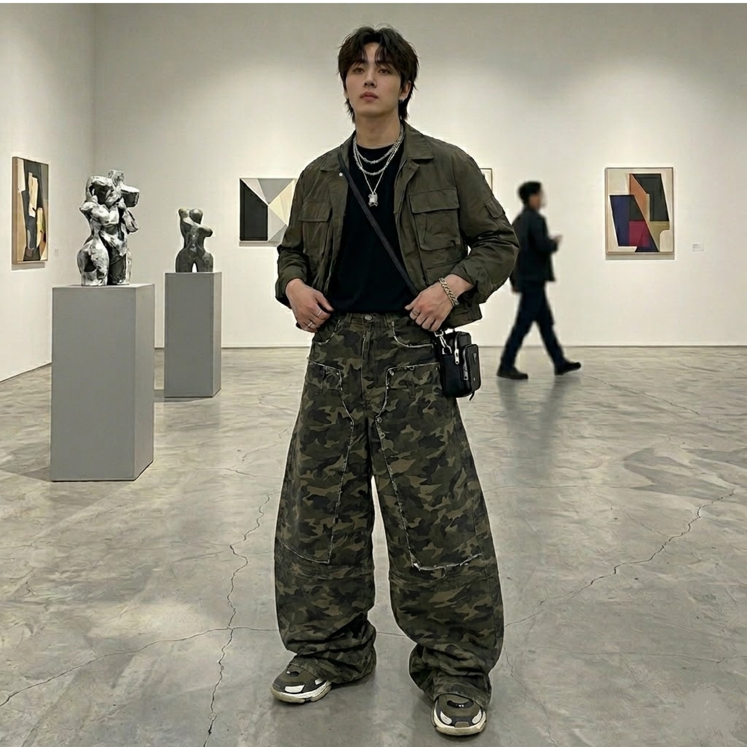 [新品] 迷彩 2WAYデザイン ダブルニー カーブパンツ メンズ ストリート系 ストリートファッション 韓国 ストリート 韓国ファッション アメカジ スケーター 裏原系 ヴィンテージ加工 ワイドデニム ジーンズ バギーパンツ カーブパンツ 迷彩 デニム