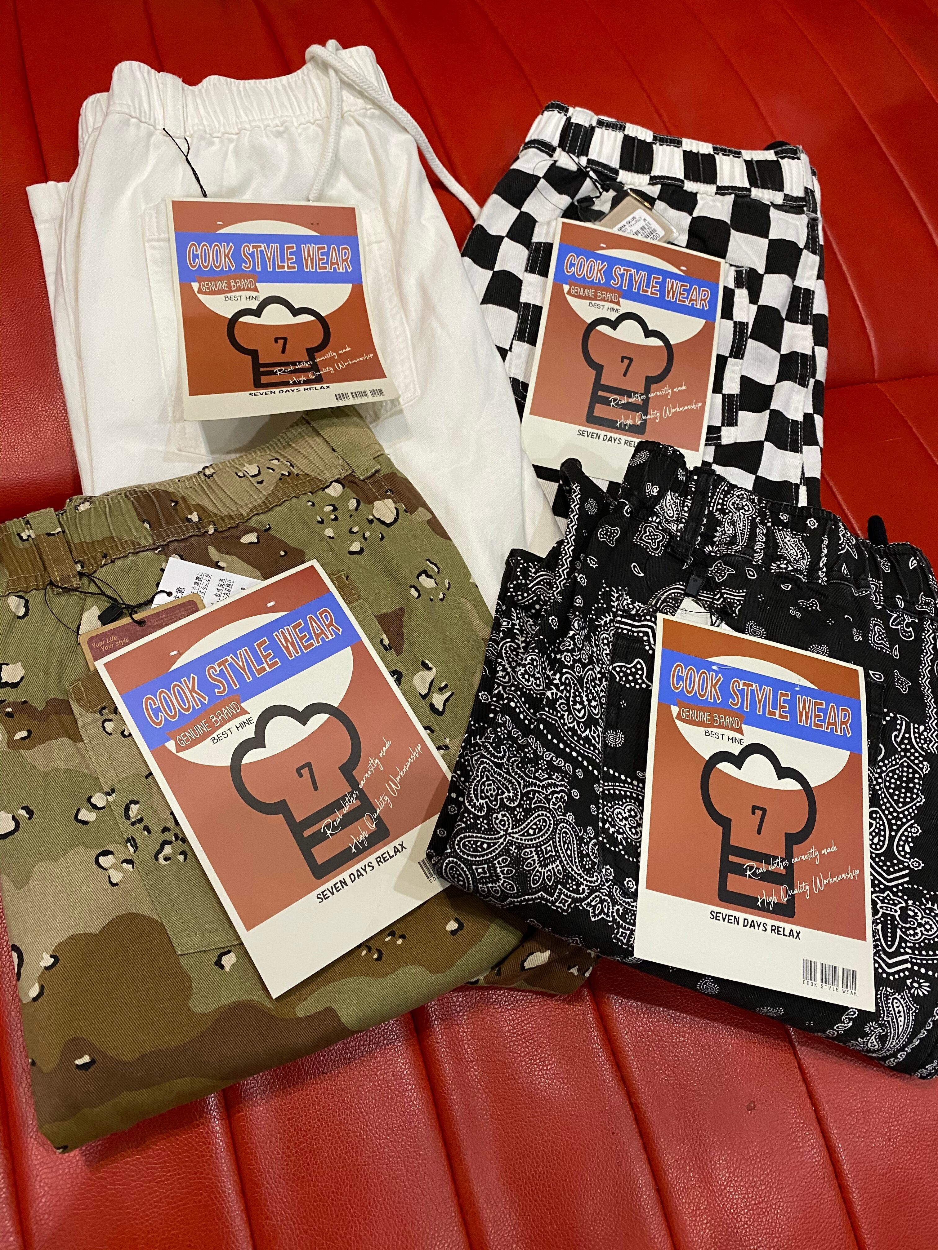 現職のコックたちが厨房で愛用していた仕事着に由来するシェフパンツ。
